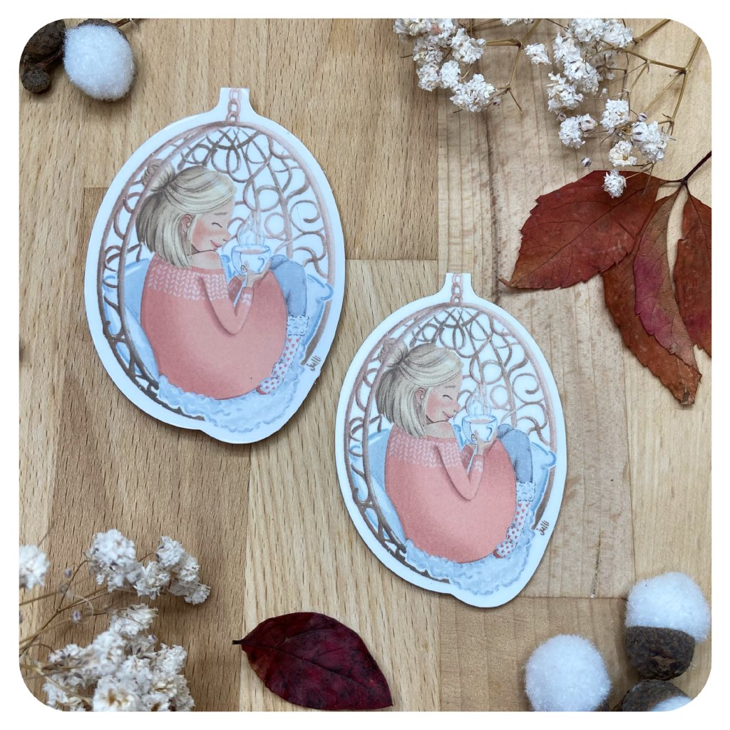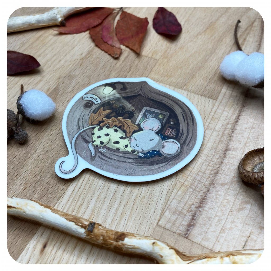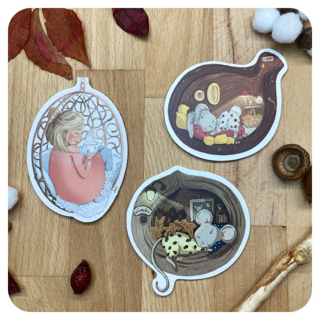 Voděodolné samolepky v autorském motivu myšky, zajdy a dívky v houpačce.